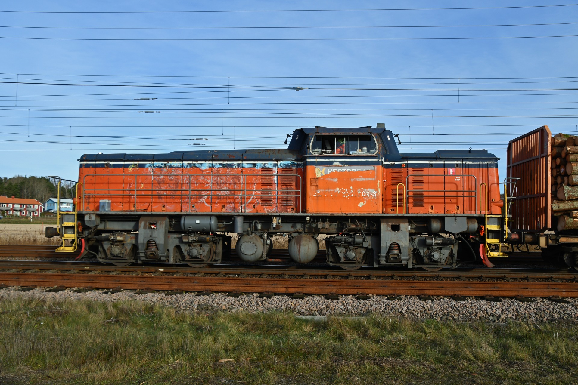 Hector Rails 841-lok, ursprungligen SJ T43, fotograferat i Värö i november 2024. Tågsättet är på väg in mot Södra Cell (före detta Värö Bruk).