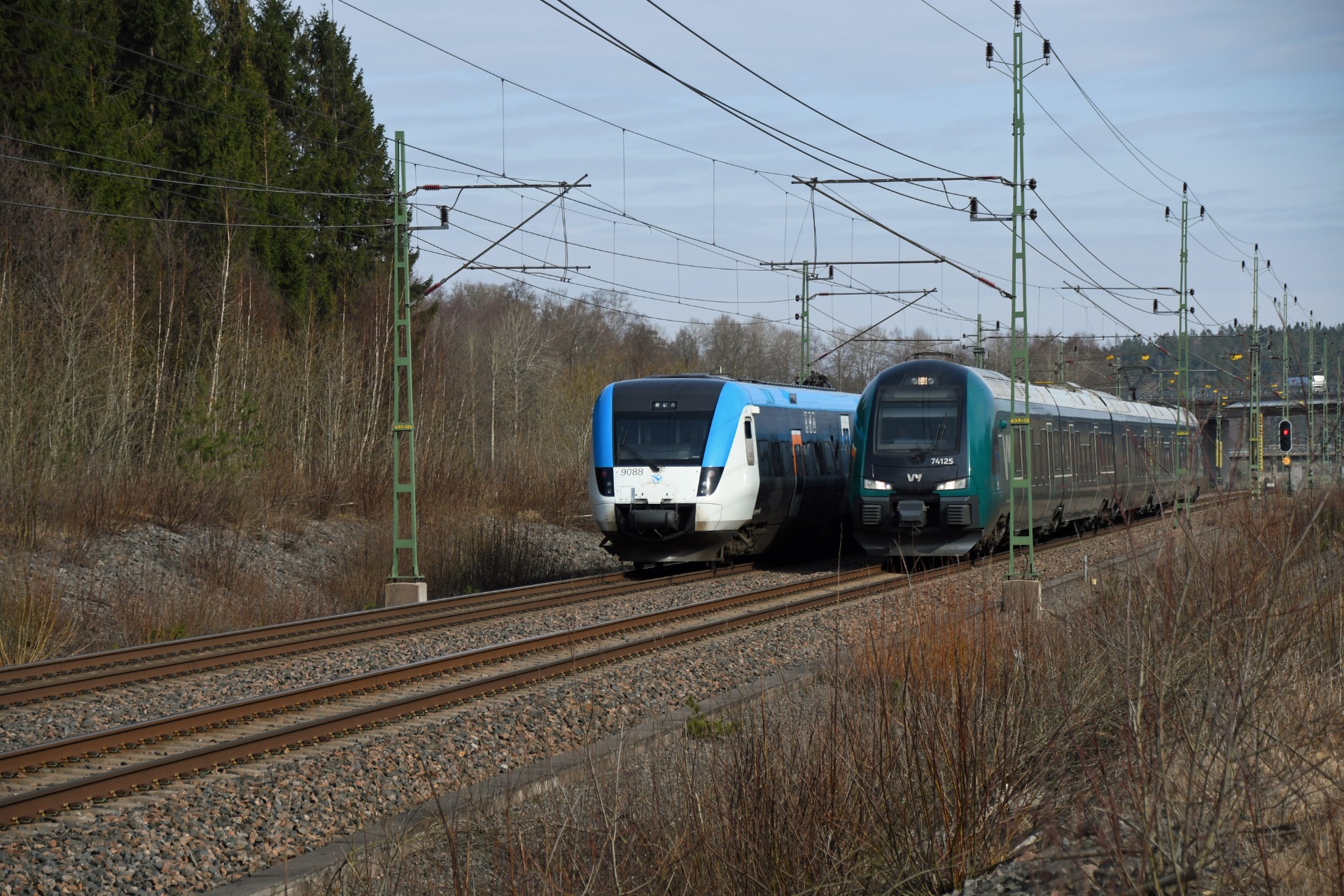 Ett möte mellan Västtågens X52 och VY:s BM74 alldeles norr om Lödöse södra. X52:an har precis startat efter ett uppehåll och farten är inte så hög. Tidpunkten är slutet av mars 2024.
