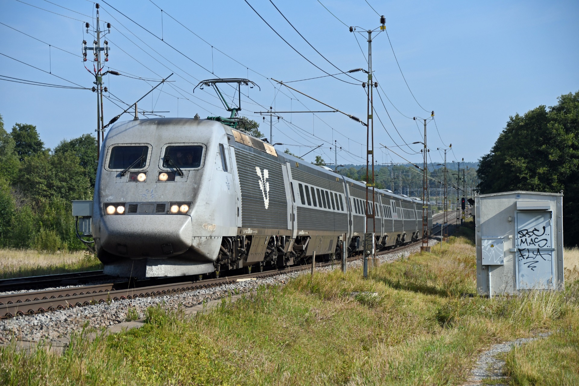 Ett X2-tåg på väg söderut strax söder om Åby i augusti 2024.