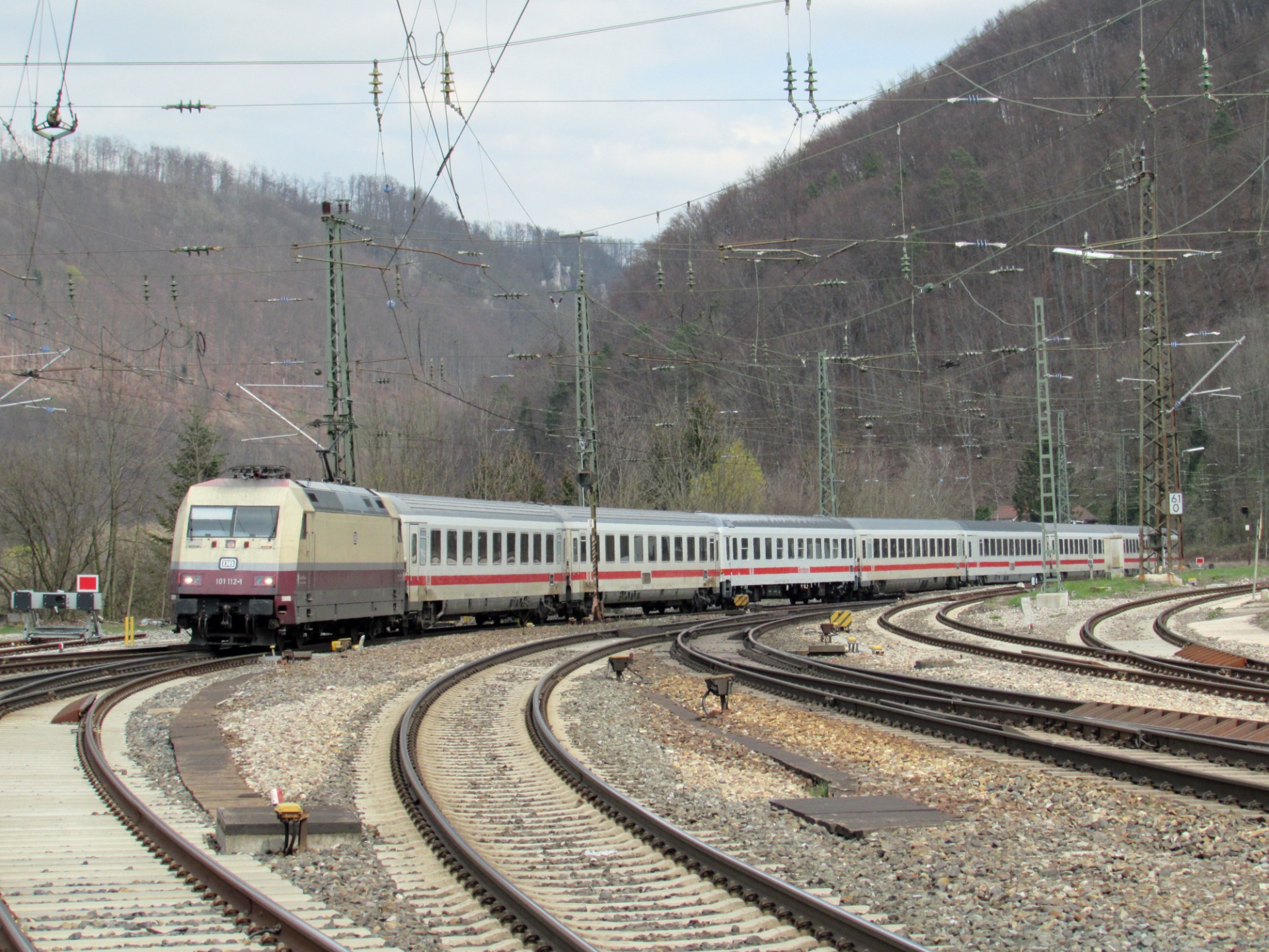 Ett tåg draget av Deutsche Bahns littera 101 arbetar sig uppför backen vid Geislingen an der Steige i april 2019.