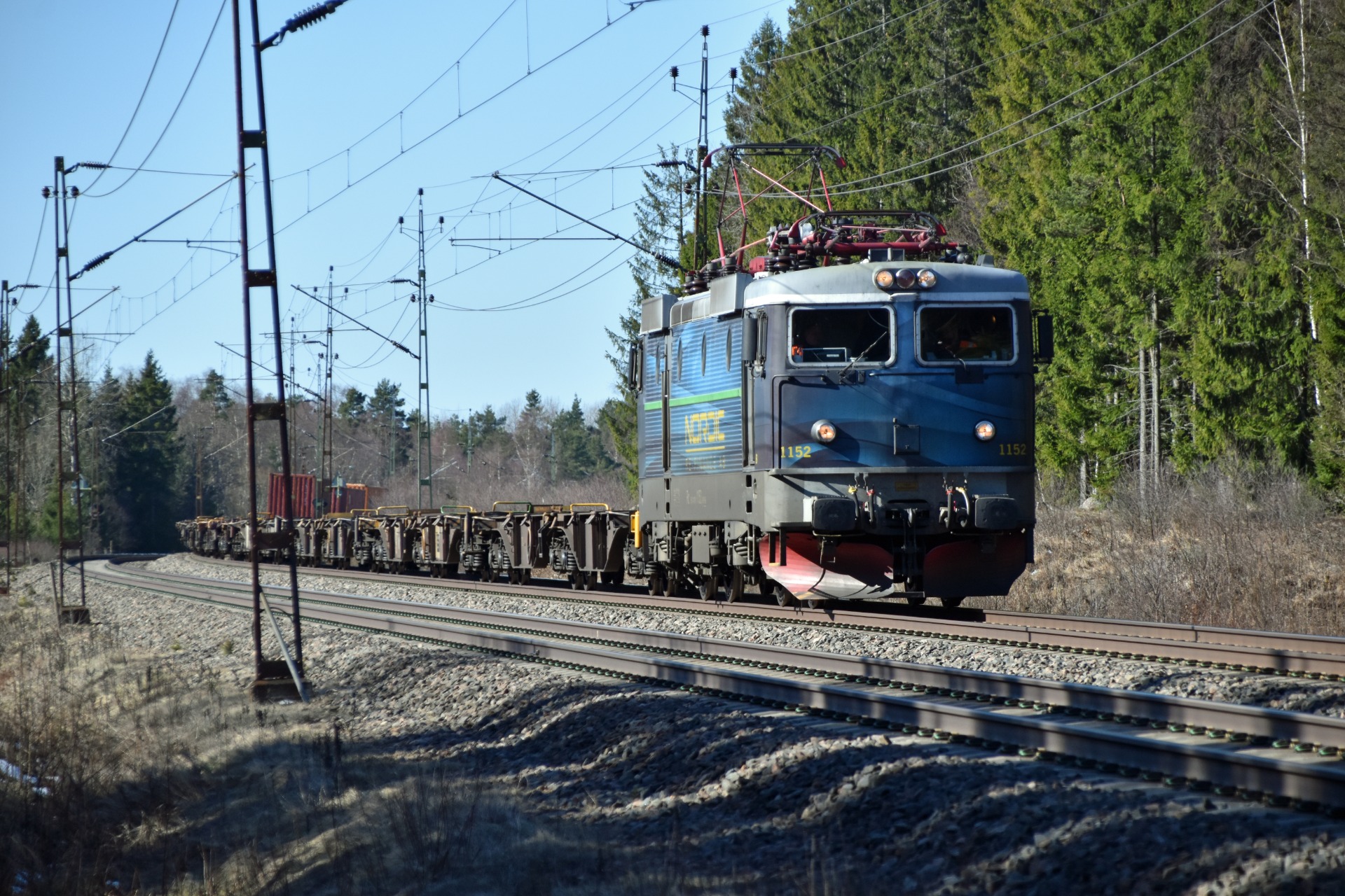 Ett godståg på Västra Stambanan mellan Vårgårda och Herrljunga med ett Rc4-lok tillhörande Nordic Re-Finance i april 2023.