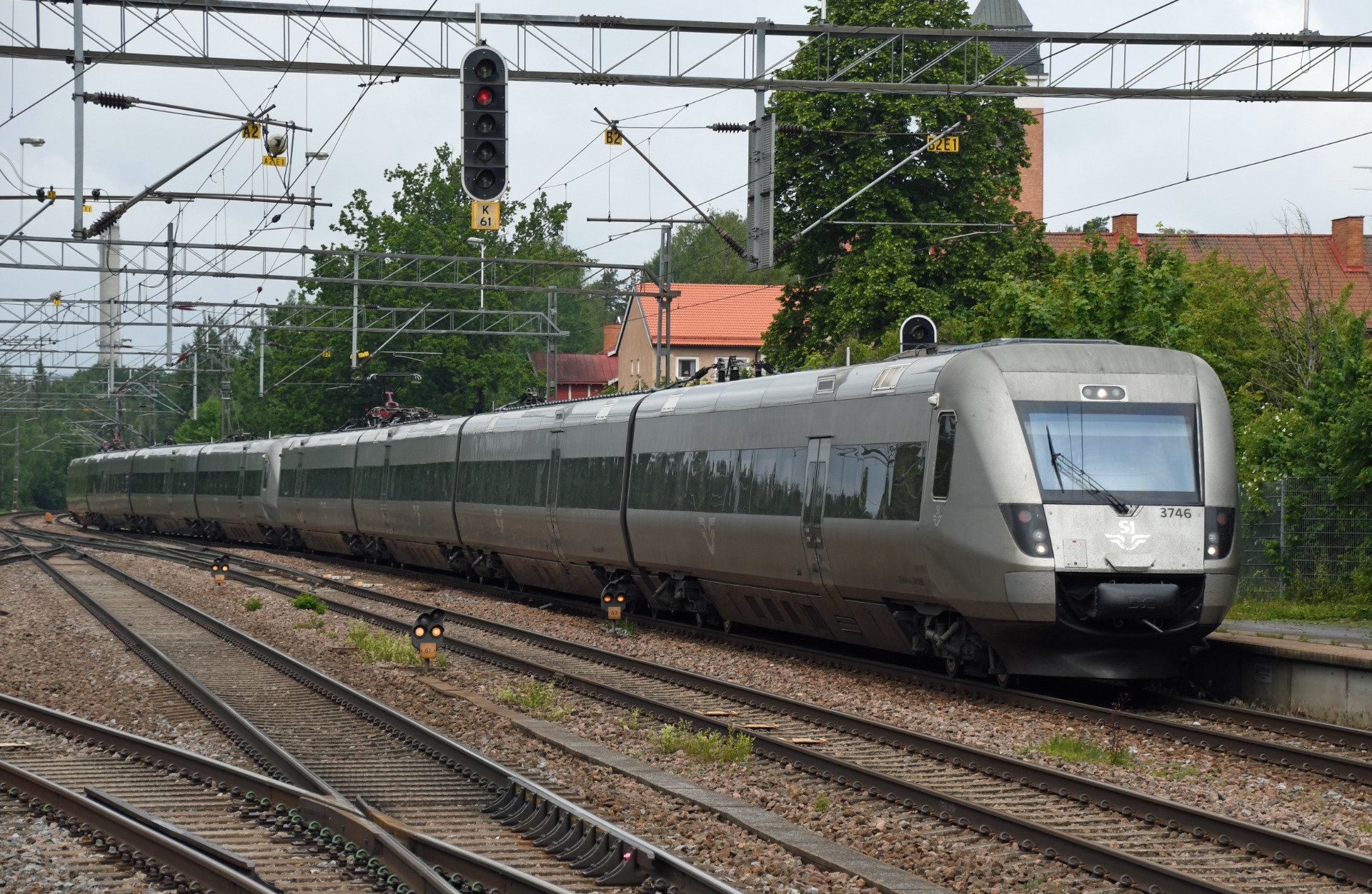 Ett tåg från Värmland till Stockholm med två multipelkopplade X55-tågsätt kommer in till Katrineholm. Det är juni månad 2025.