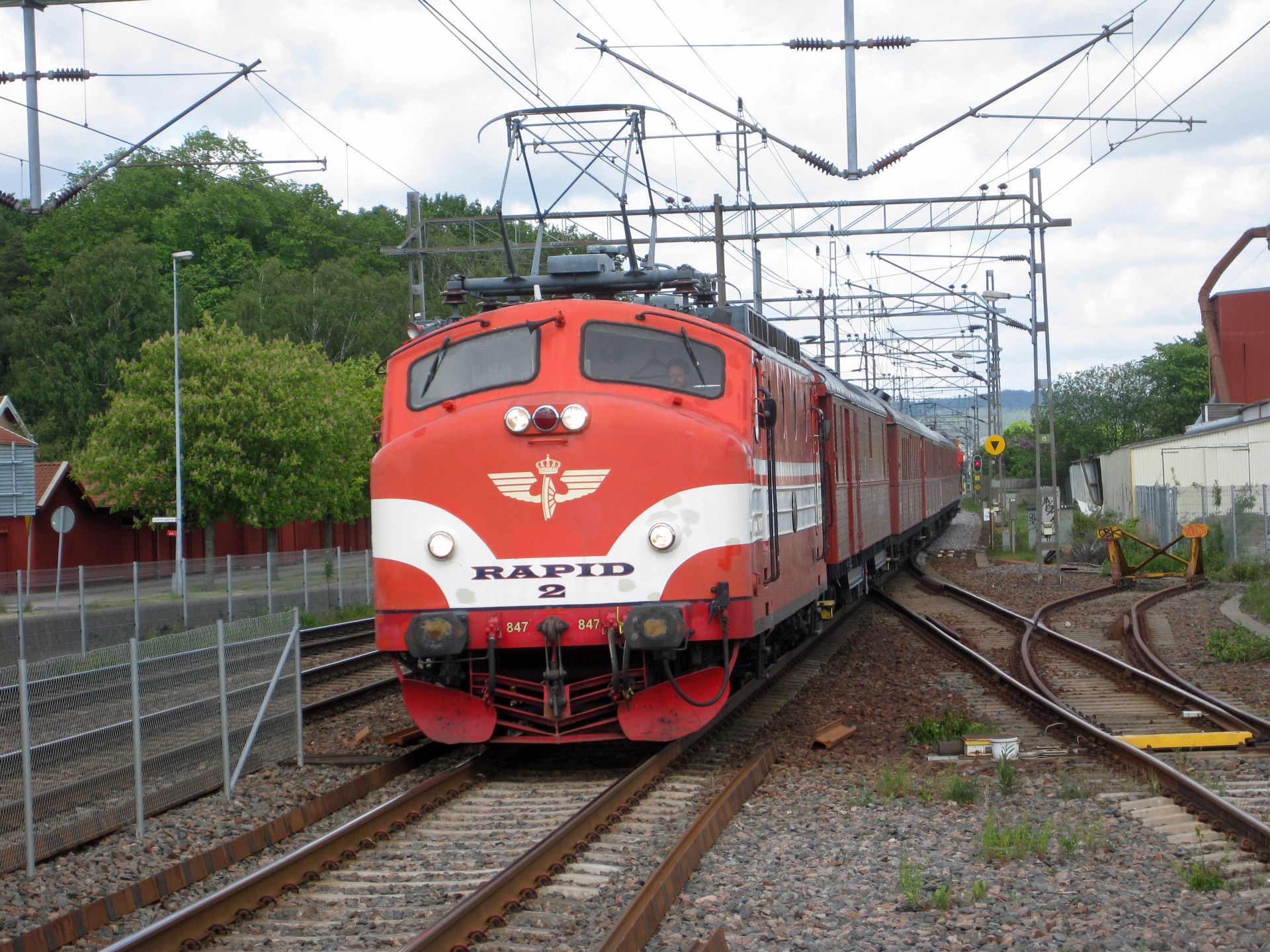 En bild från Halmstad i augusti 2025. Ett norrgående Öresundståg väntar på att Rd2 1095 ska komma in. Detta lok var, som alldeles nylevererat Rc2-lok, inblandat i en kollision med ett pendeltåg i Järna i december 1972.