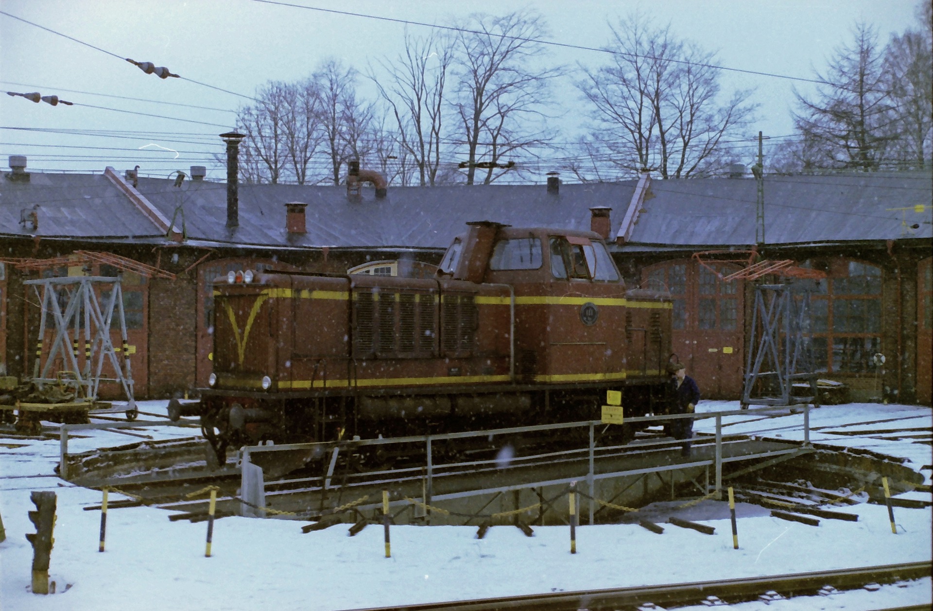 Det är år 1974 och vi ser ett V3-lok på vändskivan i Borås. Bilden tog jag med min gamla Instamatic-kamera.
