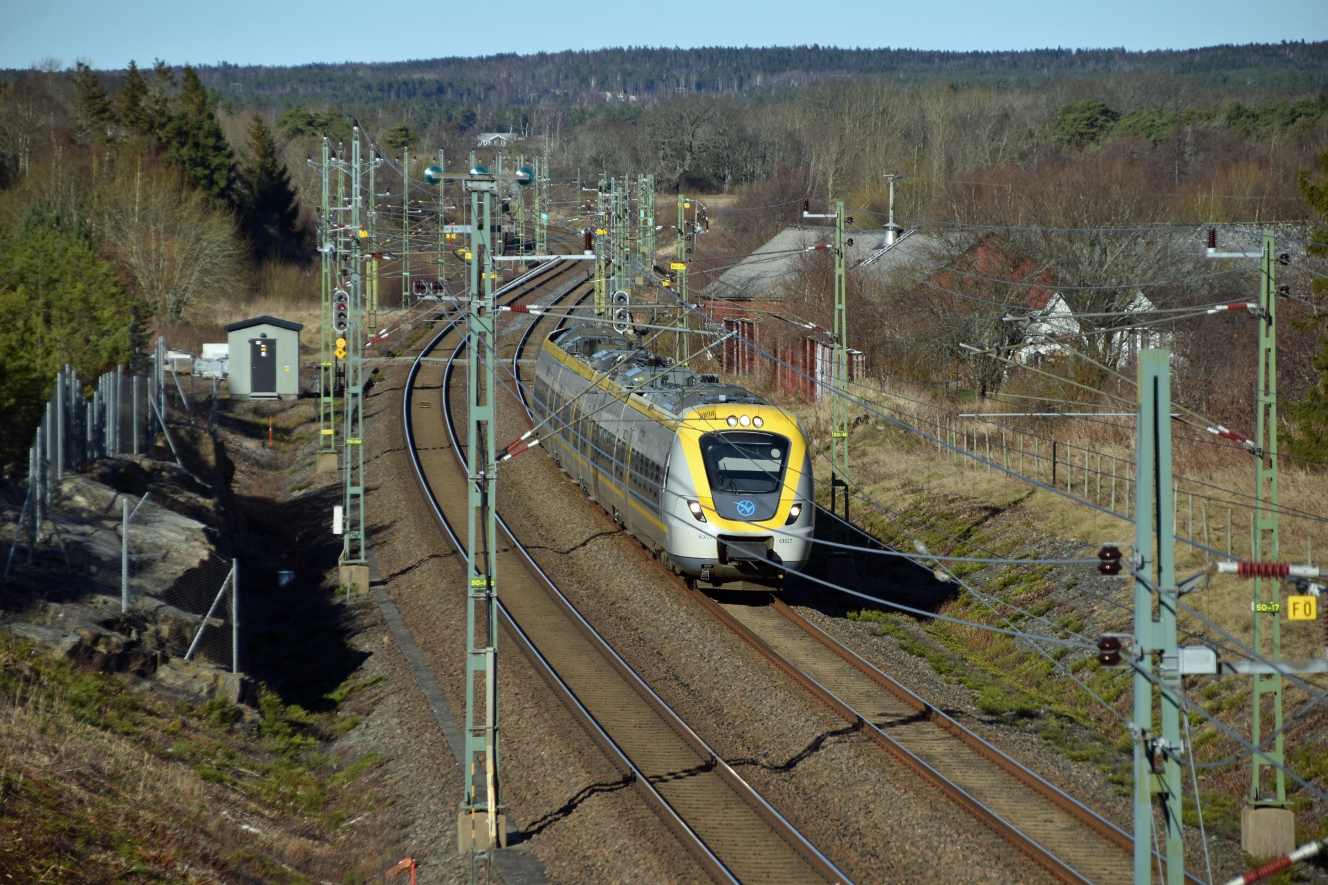 Västtågens Y31 på väg in mot Floda på färden mot Göteborg i början av maj 2024.