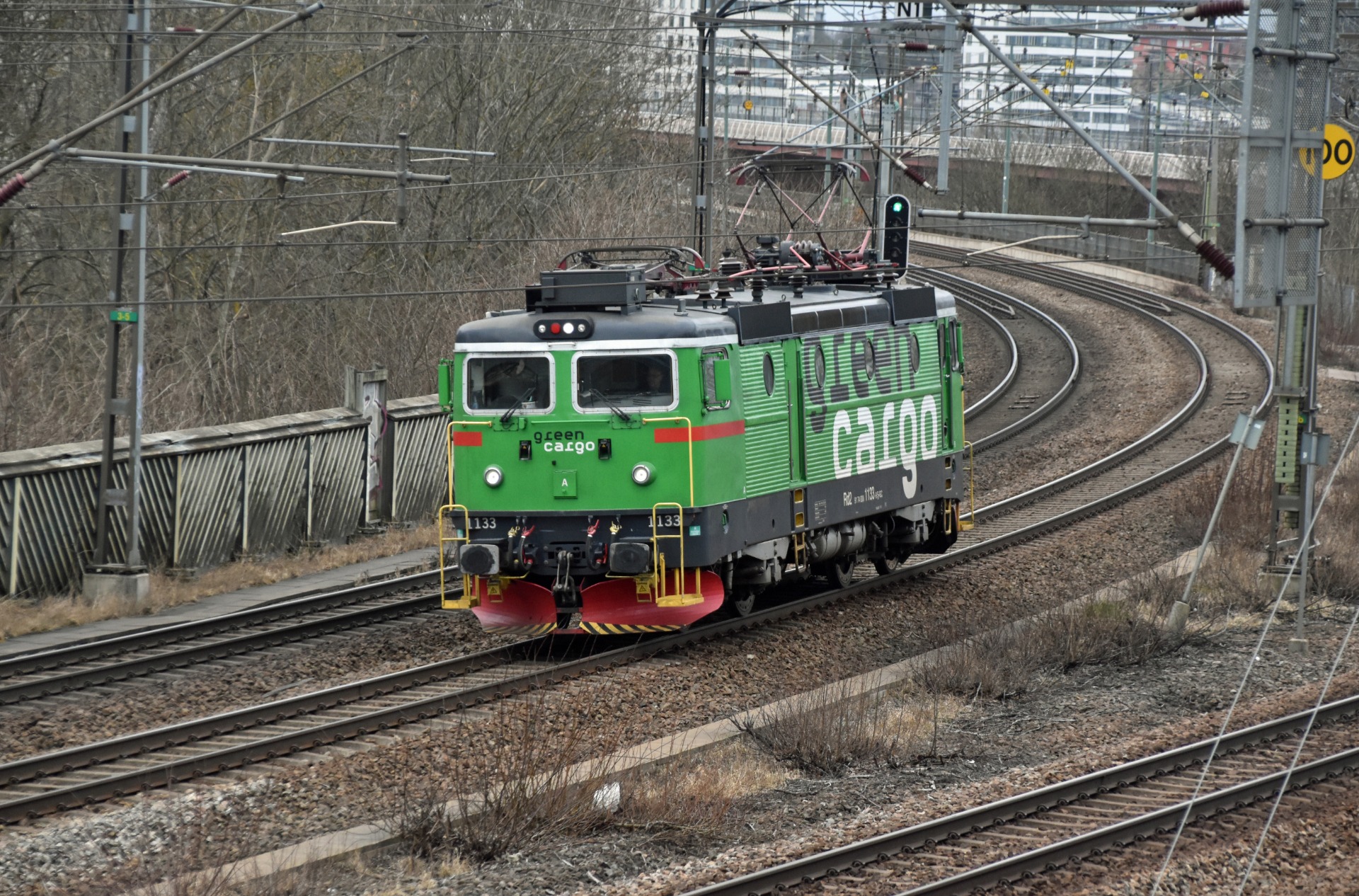 Ibland kan en "grå" omgivning lyfta fram färgerna på ett fotograferat objekt. Här är Green Cargos Rd2-lok på väg in mot Stockholms södra i mars 2022.