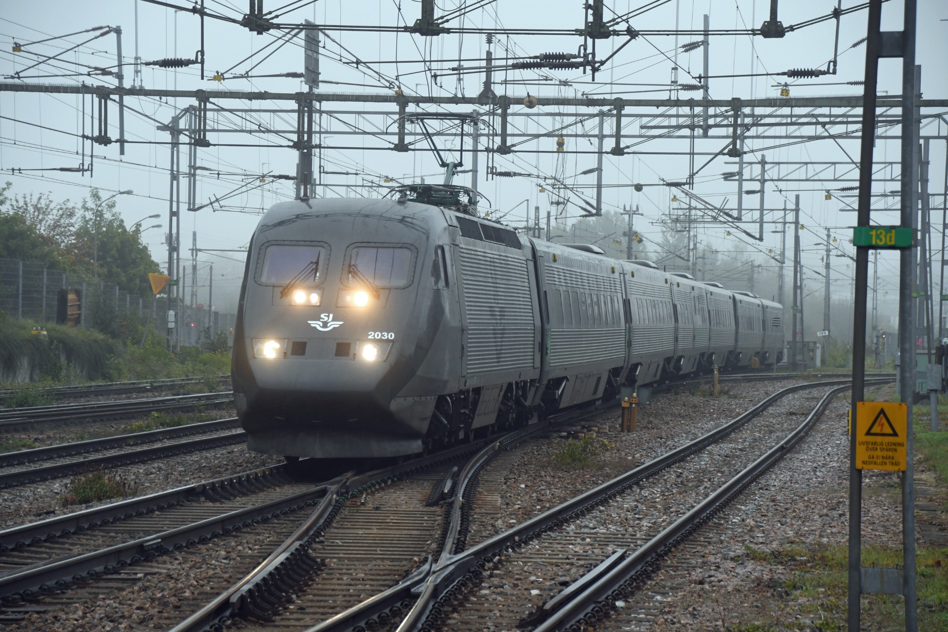 En gråmulen och lite disig dag kan göra att en bild nästan ser ut att vara i svartvitt som när denna X2C passerar genom Hallsberg på väg mot Göteborg i september 2024.