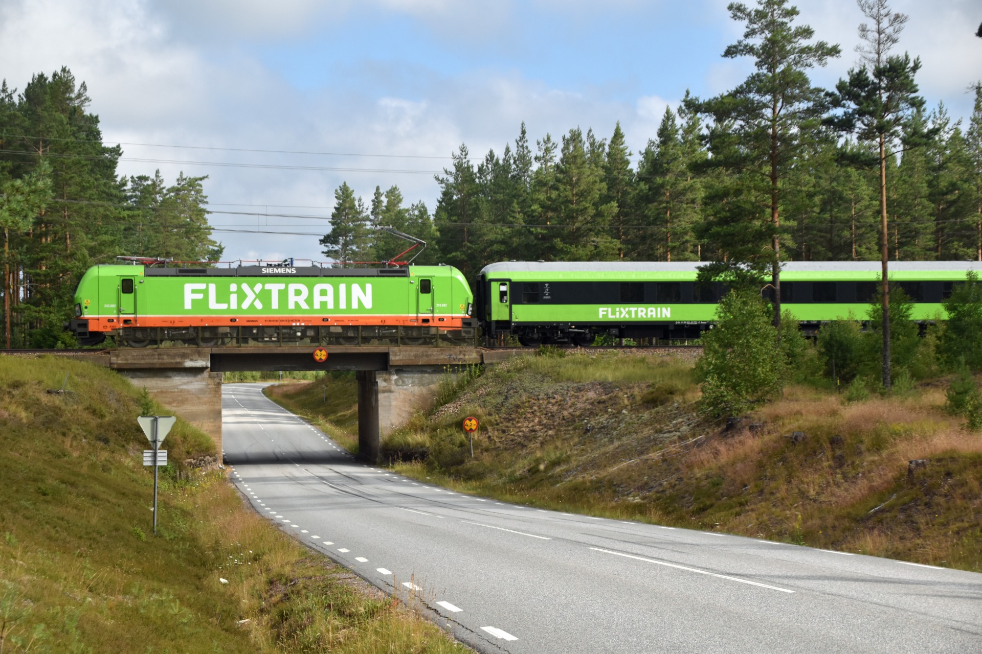 Strax öster om Laxå passerar Flixtrains tåg på sin väg mot Göteborg en julidag 2022.