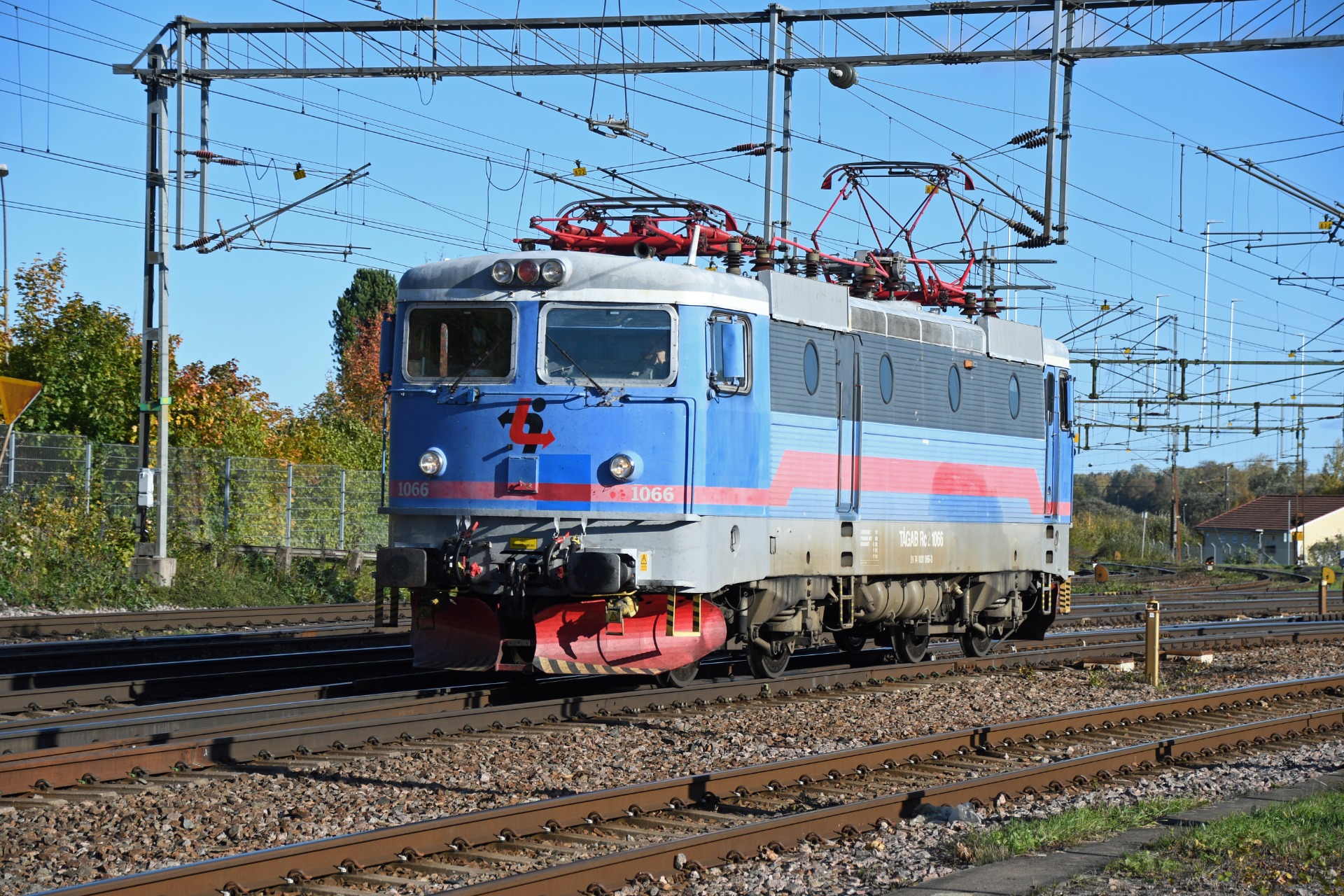 Ett ensamt Rc2-lok från Tågab rullar sakta genom Hallsberg i oktober 2023. Loket levererades 1971 som Rc3-lok till SJ.